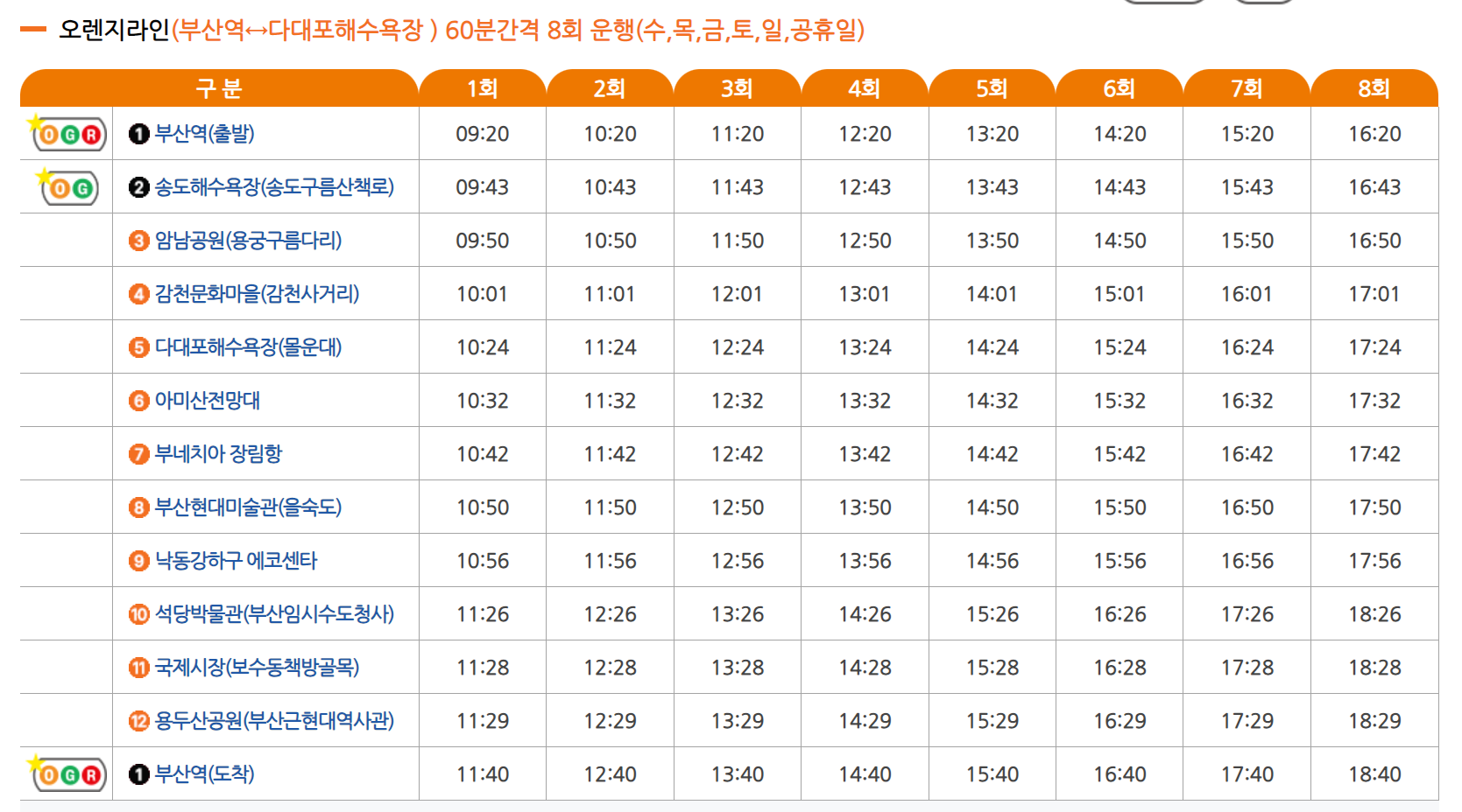 오렌지라인도 부산역에서 출발하여 송도해수욕장, 암남공원, 감천문화마을, 다대포해수욕장, 아미산 전망대, 부네치아 장림항, 부산현대미술관, 낙동강하구에코센터, 성당박물관, 국제시장, 용두산공원, 부산역 도착 코스인데, 여기도 그린라인과 비슷하게 지하철로 갈 수 없는 곳들이 많아서 부산 시티투어 버스 예약 후 이용하시면 훨씬 편리하게 이동하실 수 있습니다.